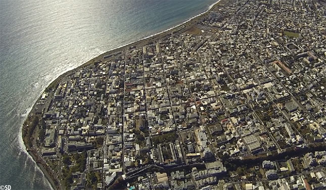 Saint-Denis est la première ville de l'île de La Réunion que le voyageur, arrivant de métropole, pourra apercevoir à travers le hublot du long courrier en phase d'atterrissage sur l'aéroport international de Roland Garros. Depuis son siège, il sera surpris par l'agencement en damier des rues du centre ville.