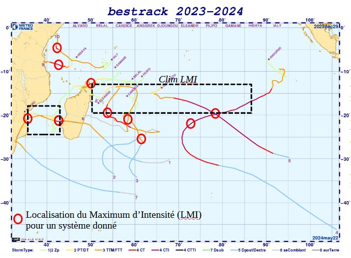 En janvier-février 2024, la localisation du maximum d’intensité (LMI) des phénomènes cycloniques se fait à des latitudes anormalement sud pour le bassin. Les 5 systèmes qui ont évolué à l’Est de Madagascar ont tous eu leur maximum d’intensité entre 19°S et 26°S, soit au niveau de l’archipel des Mascareignes ou plus au Sud. Habituellement celui-ci se produit entre 13°S et 20°S. La présence d’eaux de mer très chaudes au Sud de 20°S avec une extension prononcée vers les latitudes australes entre 60°E et 80°E, a très vraisemblablement contribué à cette situation.