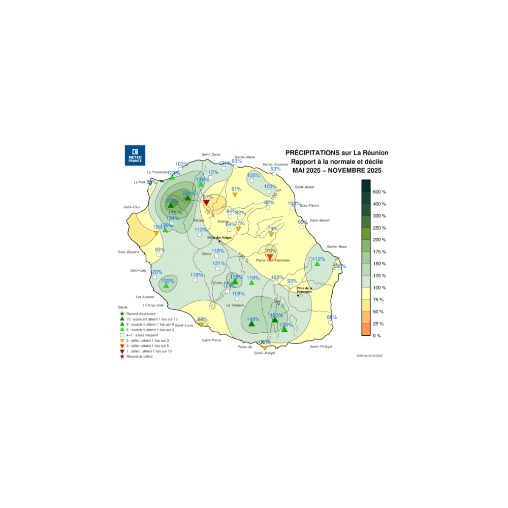 Le bilan pluviométrique global sur toute l'île de la saison sèche 2025, est excédentaire à +9% par rapport à la normale.