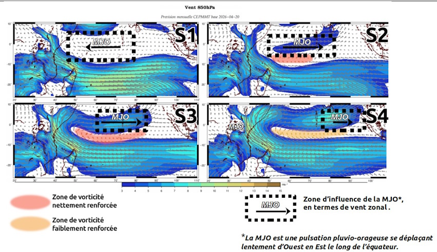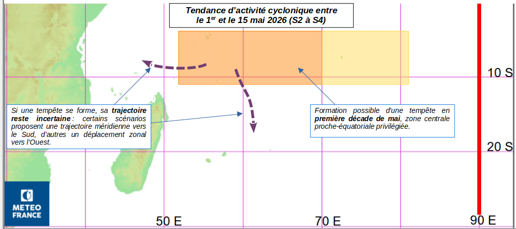 D’ici le début du mois de mai, les contraintes environnementales empêchant la formation de nouveaux systèmes devraient graduellement se relâcher. Avec l’arrivée d’une pulsation pluvio-orageuse se déplaçant d’ouest en est le long de l’équateur (la "MJO"), et malgré cette période tardive pour la saison, les conditions pourraient même devenir plutôt favorables à la cyclogenèse en première décade sur le centre et l’est du bassin. Les prévisions actuelles proposent un signal cyclonique en hausse, mais qui reste modéré. Dans ces circonstances, les habitants des Mascareignes, Rodrigues inclus, ne peuvent pas encore considérer cette saison 25/26 comme totalement terminée.