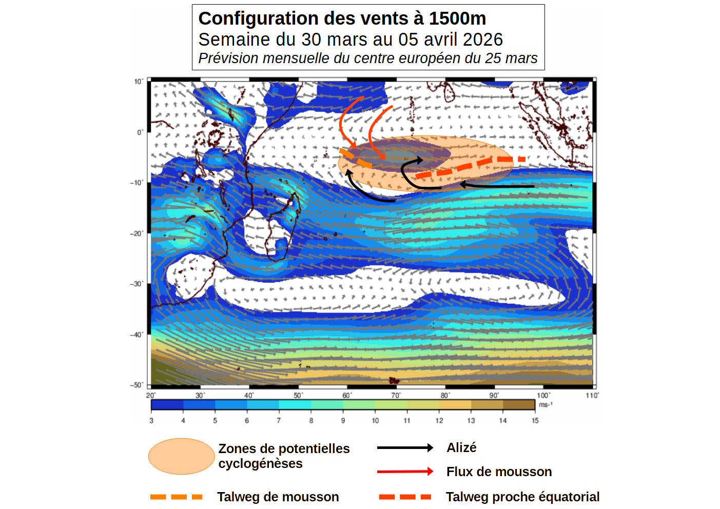 Depuis le cyclone tropical HORACIO qui a été suivi jusqu'en fin février, l'activité cyclonique est restée nulle durant ce mois de mars si on ne tient pas compte du système N°12 qui n'a pas dépassé le stade de dépression tropicale. Cette longue pause, qui a marqué la fin du cœur de saison humide, ne signe pas pour autant la fin de la saison cyclonique. En effet même si certains facteurs sont encore peu favorables, les conditions environnementales sur le sud-ouest de l'océan Indien devraient s'améliorer dans l'ensemble durant les deux prochaines semaines. Elles pourraient alors devenir plus propices à une nouvelle activité cyclonique en S2 et S3. Si des systèmes venaient à se former en S2 ou S3, leur existence pourrait alors se poursuivre ensuite en S4. Les potentiels systèmes se formant entre S2 et S4 se dirigeraient d'abord vers l'ouest et prendraient ensuite rapidement une composante vers le sud pour contourner l'anticyclone. L'enjeu éventuel sur les terres habitées se limiterait donc à l'archipel des Mascareignes. Par la suite, les conditions devraient recommencer à être peu à peu défavorables mais de nombreuses incertitudes nous empêchent à ce jour de prévoir plus clairement l'activité cyclonique à partir de S4.