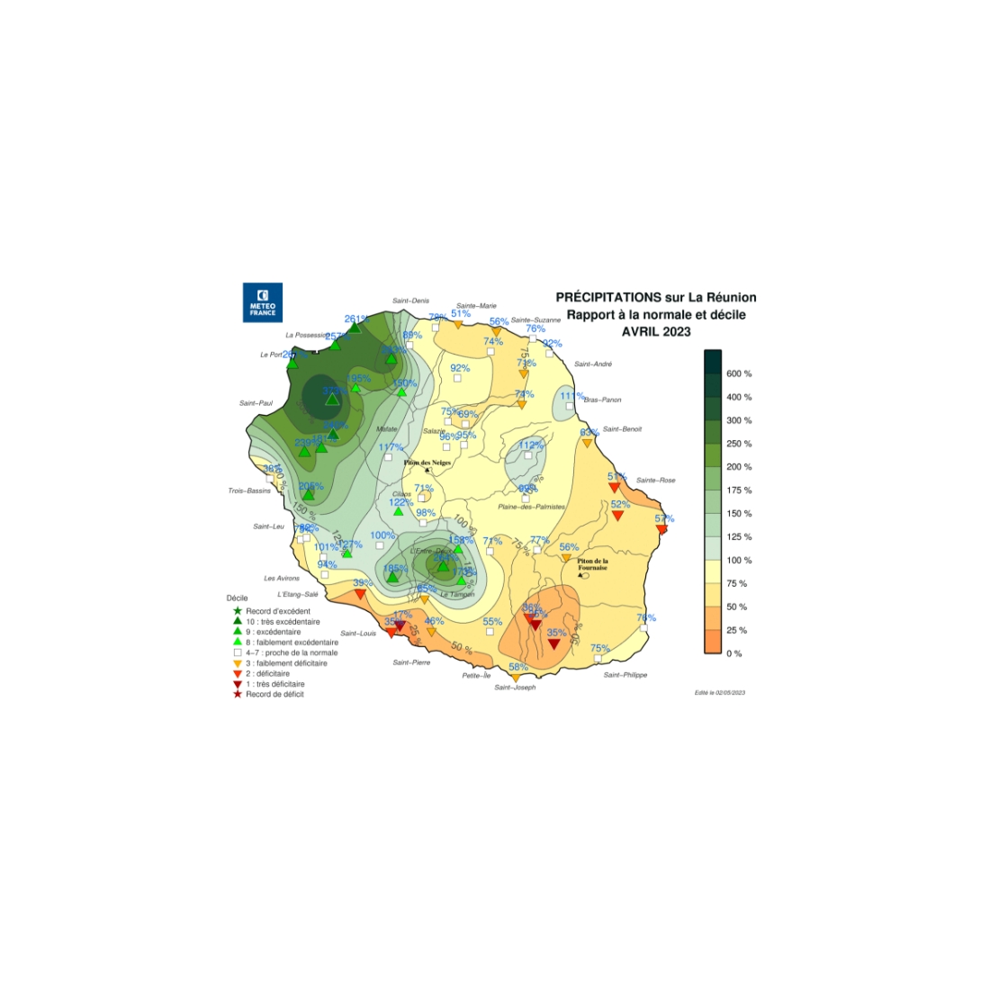 (pour un mois d’avril)- Bois-de-Nèfles St-Paul : 276,1 mm (3ème valeur la plus élevée - record : 376,5 mm en 1978 - début des mesures en 1952).
