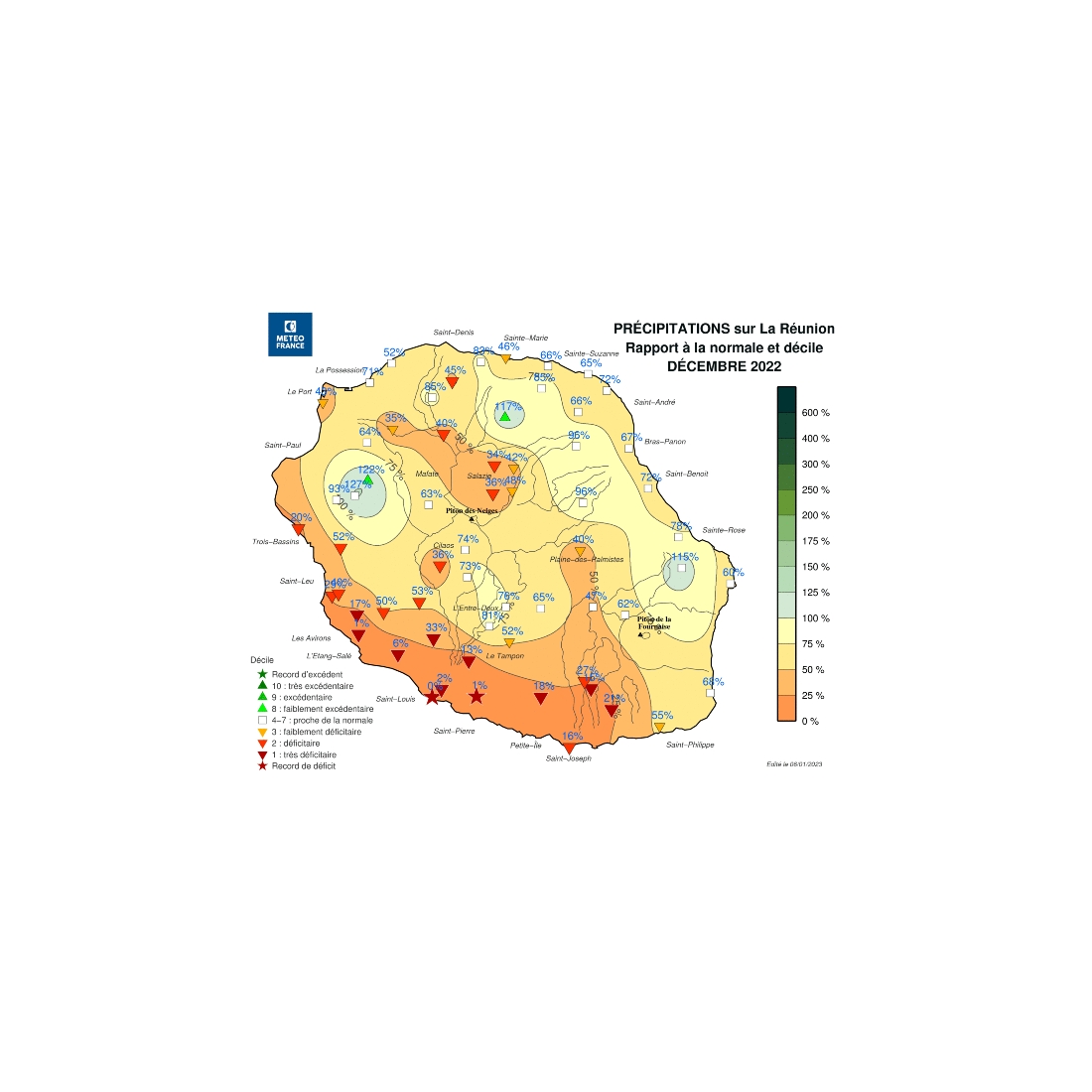 La pluviométrie moyenne sur l’île est déficitaire de 40%. Le Sud Sauvage et le Sud-Ouest sont très déficitaires tandis que le Nord, l’Est et les Hauts sont proches des normales ou faiblement déficitaires.