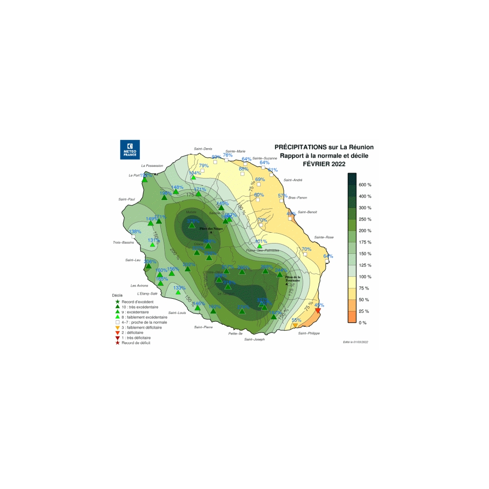 - Grand-Galet : 620,0 mm le 3 (ancien record : 614,8 mm le 24/02/2007 - début des mesures en 1954),