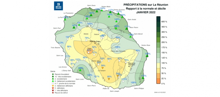 Sur les secteurs fortement excédentaires, il pleut 3 fois plus que d’habitude à La Nouvelle, Grand-Coude, au Pont d’Yves, au Tampon, Grand Galet et Cilaos, 2 à 3 fois plus à Piton-Bloc, Commerson, Bellecombe-Jacob, Plaine des Cafres, Plaine des Makes, Ilet à Cordes, Bois de Nèfles St-Paul, Le Port, St-Leu et Ligne-Paradis. Ailleurs on remarque : +80% à La Crête, +70% à Plaine des Chicots et Le Guillaume, +65% à Belouve et Les Avirons, +60% à Piton-St-Leu, +55% au Tevelave.