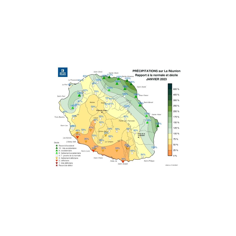 - Sur le Nord et l’Est excédentaire, il pleut 2 fois plus que d’habitude à Gillot-Aéroport et Le Colosse. Ailleurs on remarque : +90% à Gros Piton Ste-Rose, +70% à Grand-Hazier, +65% au Chaudron et à Menciol, +60% à Beauvallon, +50% à St-Benoît, +30% à Rivière de l’Est.