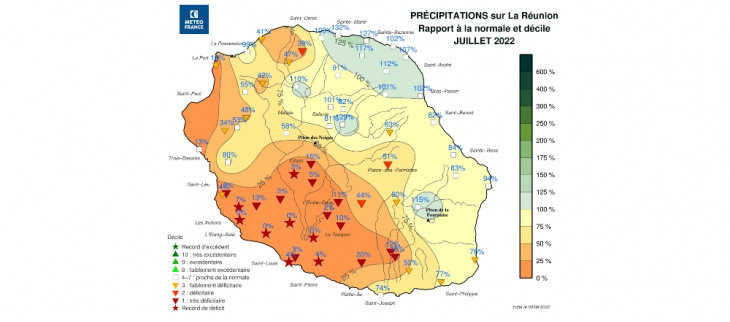 Bilan moyen sur l’île proche de la normale, mais contrasté. Le Sud-Ouest et le Sud Sauvage sont excédentaires tandis que les valeurs sont faiblement déficitaires sur le Nord et l’Est.