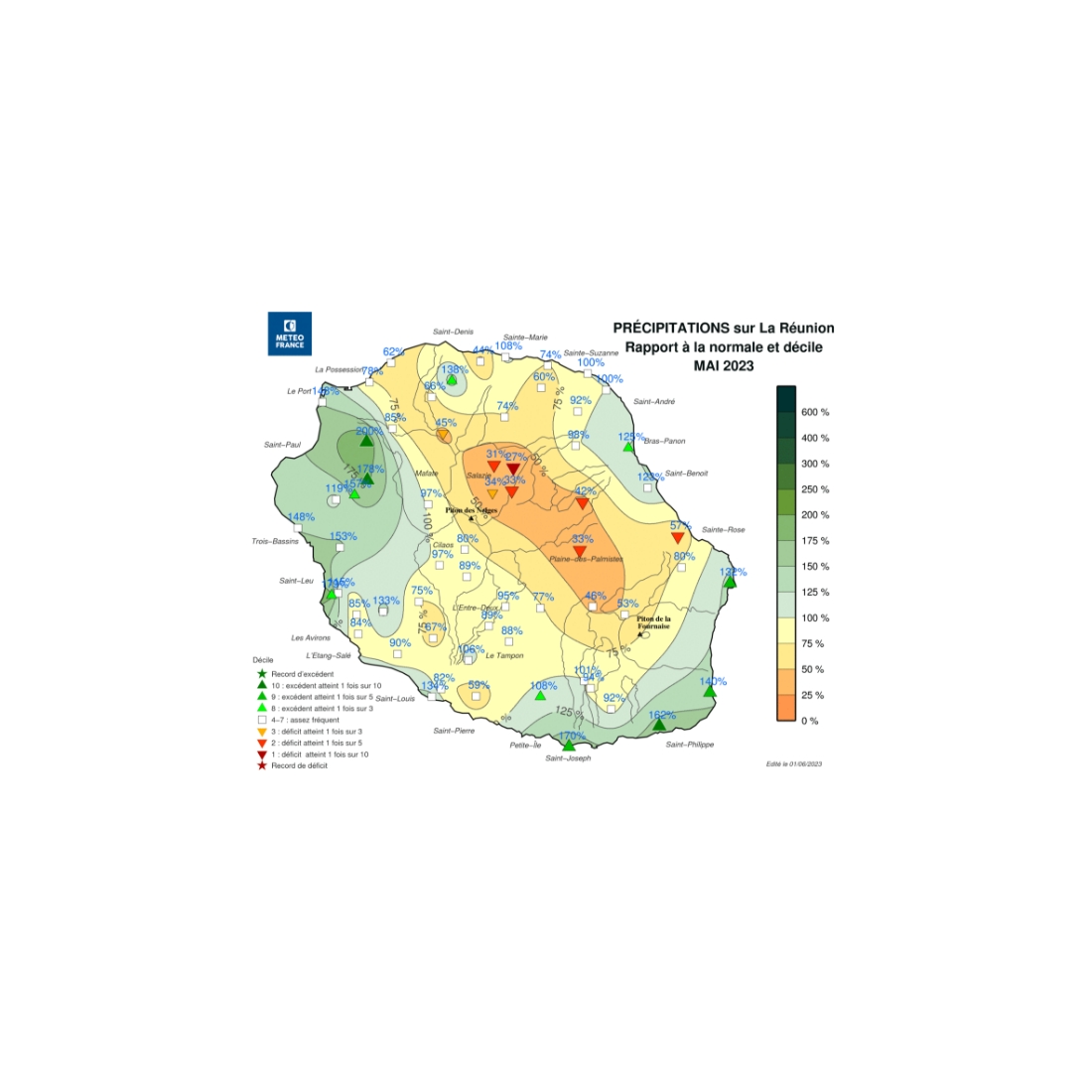 - 2 fois plus de pluie que d’habitude à Bois-de-Nèfles St-Paul, +80% à St-Leu, +55% au Guillaume.