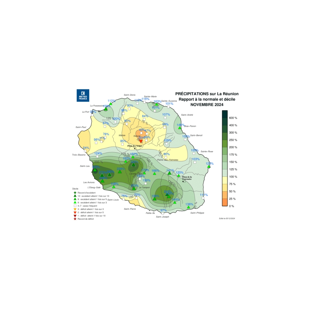 Cela se ressent sur le bilan de ce mois de novembre : des Avirons à Grand Galet en passant par le Tampon et Cilaos, les cumuls mensuels de novembre 2024 sont ainsi entre 1 et 3 fois la normale mensuelle.