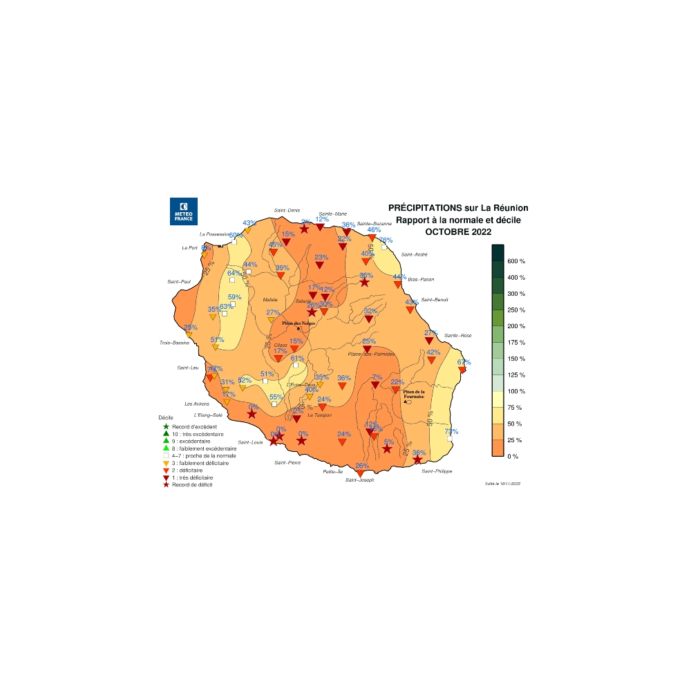 En l’absence de fronts froids et soumis à des alizés secs, c'est le mois d’octobre le plus sec sur 51 ans de mesures de 1972 à 2022 (24 mm pour une moyenne départementale de 74 mm). Ce qui aggrave les déficits cumulés depuis le début de la saison sèche (mai 2022). Néanmoins, comme c'est le mois habituellement le plus sec de l’année, les conséquences de ce déficit record sont relativement minorées pour l’Ouest et le Sud-Ouest généralement faiblement arrosés en octobre.