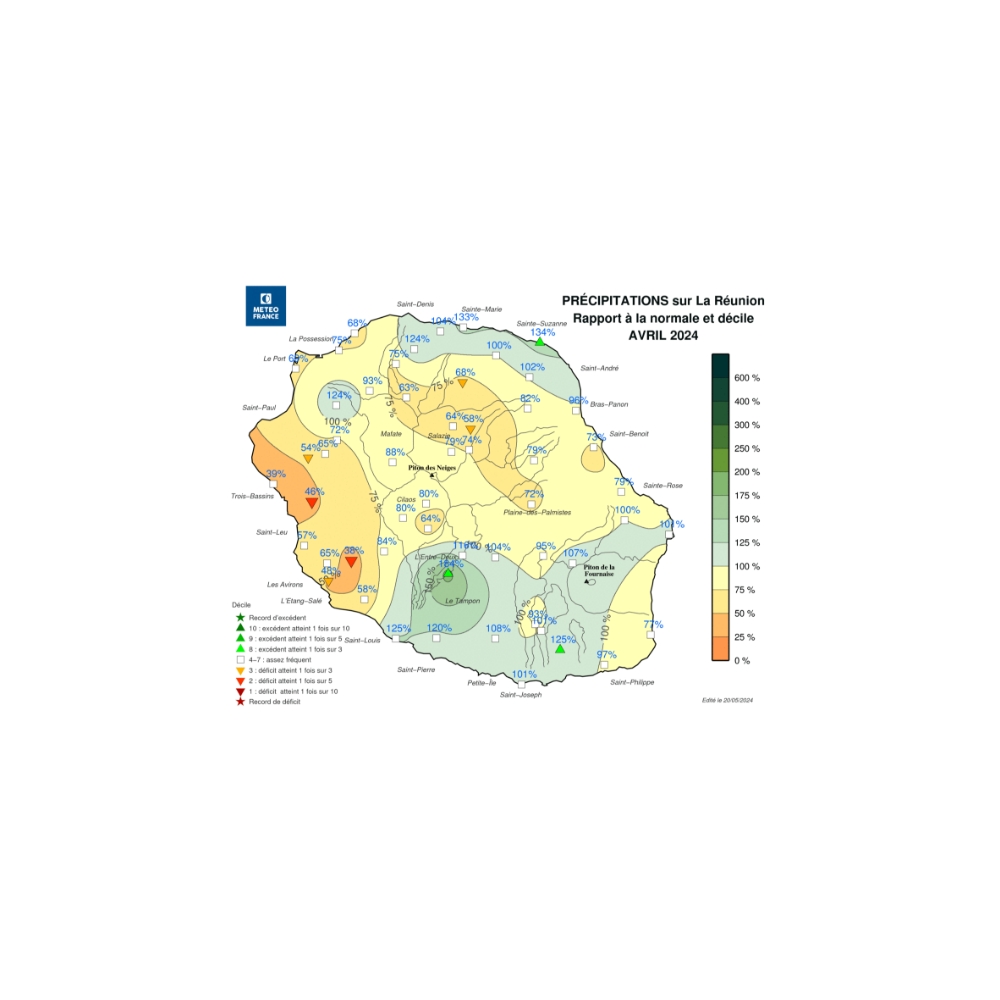 Parmi les postes habituellement bien arrosés, on relève un écart aux normales d’avril : -40% à Salazie-Village, -35% à Piton-St-Leu et Mare à Vieille-Place, -30% à La Plaine-des-Palmistes et La Plaine-des-Fougères. Mais on mesure +35% à Bois-Rouge, +25% à la Crète.