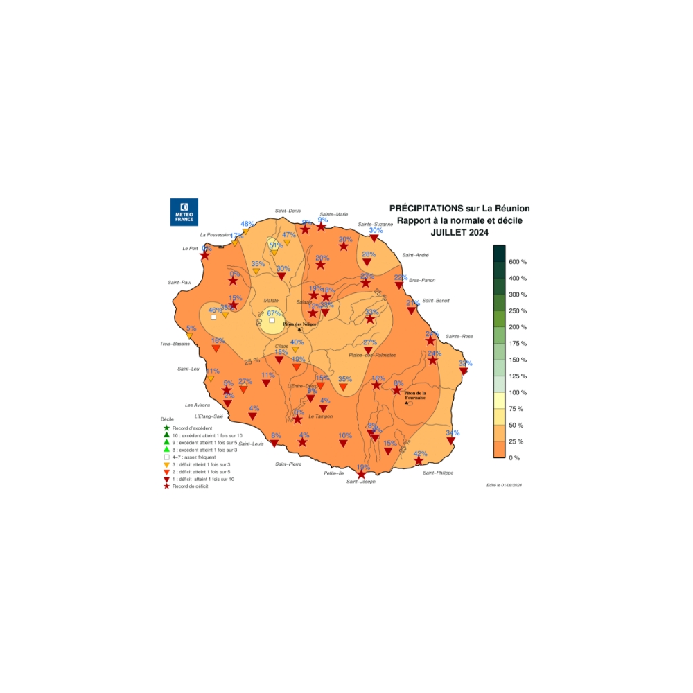 Bois de Nèfles St-Paul : 0,0 mm / normale à 13,0 mm, soit 0 % - début des mesures en 1952)Les stations suivantes sont au 2e rang des mois de juillet les plus secs :
