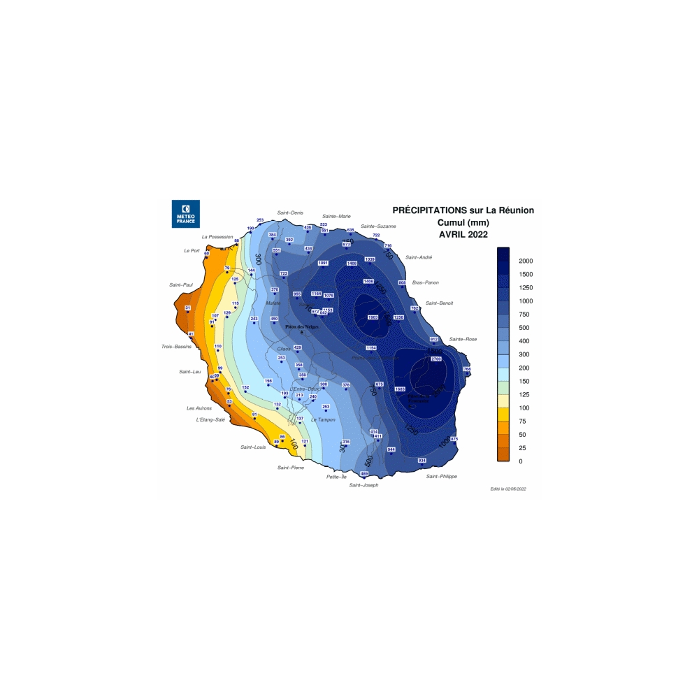 Avec 541 mm enregistrés en moyenne sur La Réunion (pour une normale de 226 mm), ce mois d'avril 2022 est le plus pluvieux depuis 50 ans, détrônant le mois d'avril 1987.