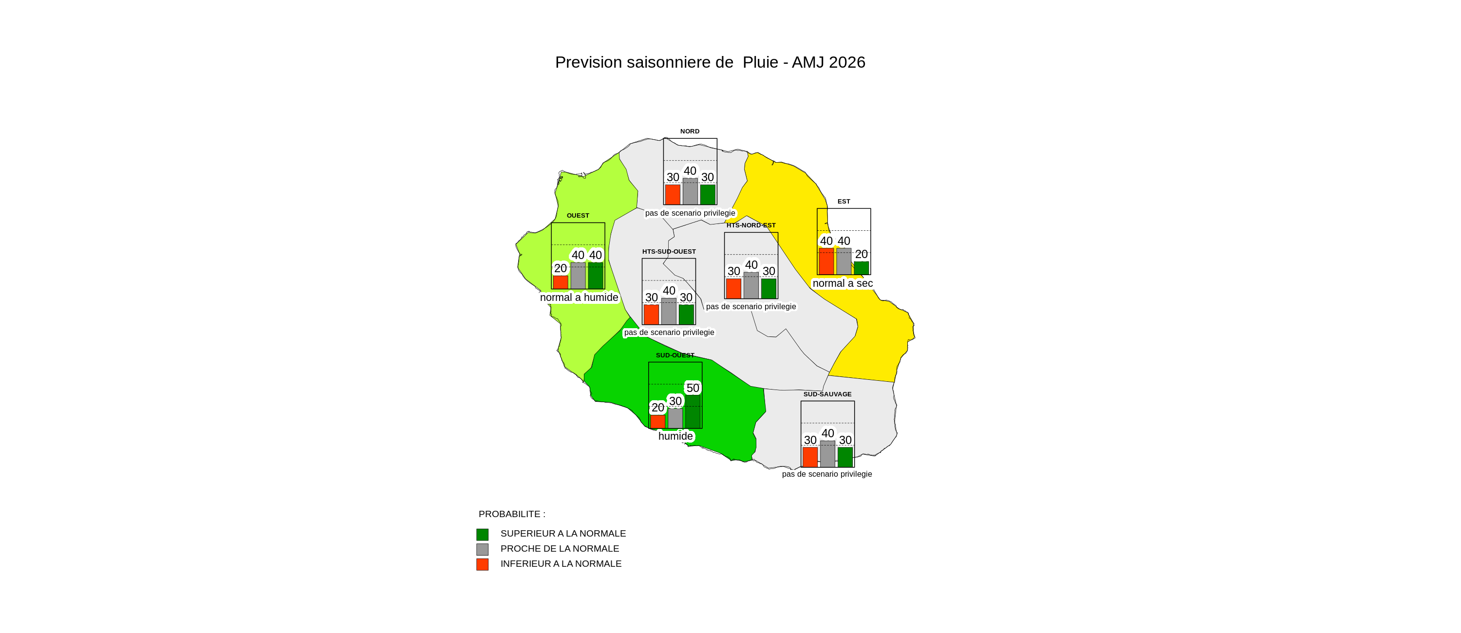 Au cours du prochain trimestre (Avril-Mai-Juin), le régime pluviométrique prévu est très incertain sur un axe nord-sud incluant les hauts de l’île. L’est devrait connaître une situation normale à déficitaire tandis que dans l’ouest et le sud-ouest, ce sont des conditions plus excédentaires qui devraient prévaloir. Le régime d’alizés devrait tarder à se mettre en place. Les températures moyennes sont toujours prévues au-dessus des normales de saison sans atteindre des niveaux exceptionnels.