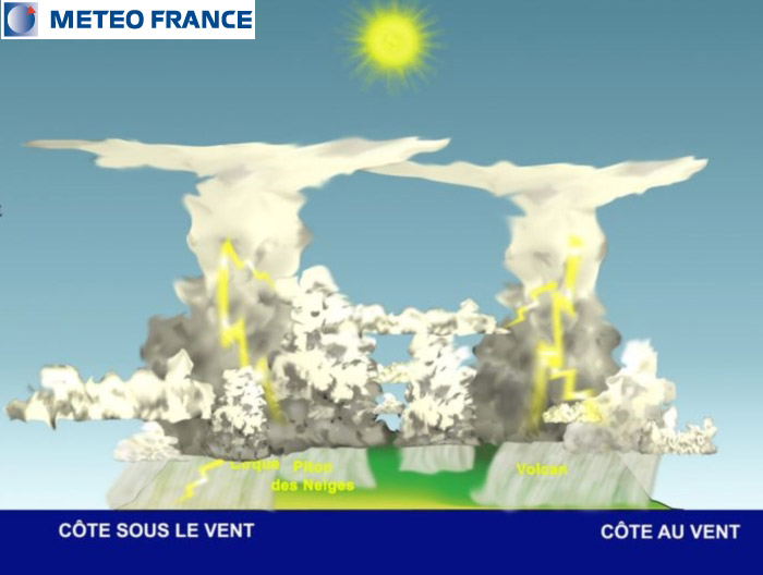 Cette situation décrit une journée classique de saison chaude lorsque La Réunion est épargnée par les systèmes tropicaux organisés (perturbations, dépressions, tempêtes, cyclones).